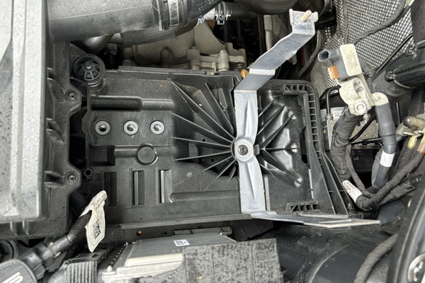 プラス側のケーブルをターミナルから外したら、手前(車の方向から言うと左側)の隙間に逃すのがコツだ。逃さないと、バッテリー底を押さえているボルトが外しにくいのと、バッテリー自体を車体に対して前方へ引くスペースがない。バッテリは車体前方にずらさないと上に上げられない。邪魔してるエアークリーナーの蓋を外すかどうか迷ったが、外さなくても大丈夫。プラスのケーブルを手前に逃がすためには、電流センスの配線も事前に外すことが必要。あとバッテリを上から抑えている金具も外す(10mmレンチ)。
