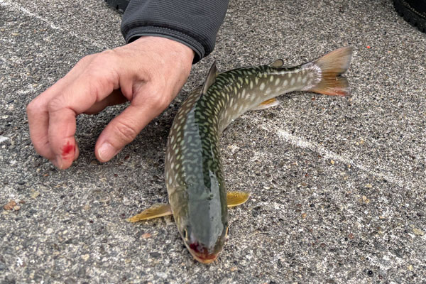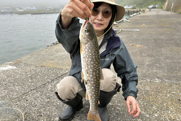朝、釣りに参戦。妻がアメマスヒット。クルセイダー13g Gold。