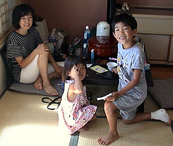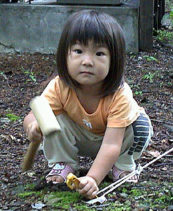 | ■8月4日 朝からカズの調子悪し。 雑炊を作って食べさせると、やっと元気になってきた。 ミヤマクワガタがバンガローの前にいて捕まえた。 このまま、もう一泊することに。 |