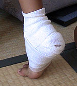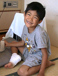 ■7月29日 北九州を出発 夕方に敦賀へ 敦賀に早く着いたので海で遊んでたら、カズが貝でかかとを切って、流血が止まらなくなり、急遽病院へ行った。 なんとか、くっつけたんだけど包帯から血がにじんでいる。 時間があったのが、せめてもの救い。 写真は、笑ってるけど大変でした。結局旅の間中、あちこちの病院で処置してもらいながらのキャンプになりました。 最後まで、キズ口はふさがらなかった!