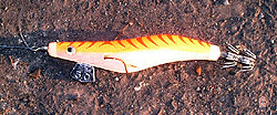 イカ用のエギです。 こんなんで釣れるのかなー? ちょっとケチって560円の買ったけど、釣具屋のおじさんは、1000円位のが泳ぎが違うって言ってました。