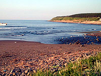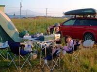 さて、この日はもう時間がなくなり、羅臼まで走って、羅臼温泉野営場に泊まる事にした。夕方は時間がなく、釣りはお預け。せっかく羅臼にいるのにもったいないが、しかたなし。途中、天気が良くって、国後島が良く見えた(めずらしい→)。 羅臼温泉野営場は、いつも夏は超満員だが、今回はちょっとピークをはずしているので、なんとか場所を確保。それでももうほとんどサイトが無かった。うちはトイレの前の空きスペースにもぐりこんだ。ここは、有名な熊の湯温泉のすぐ上になる。