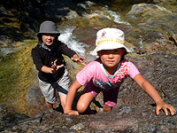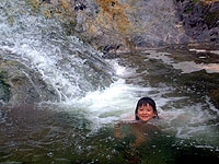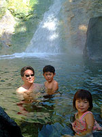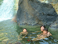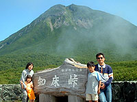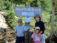 羅臼はいつも天気悪いけど、この日は珍しくいい天気で、朝早くにテントを撤収し、カムイワッカの滝に挑戦だ! アユも小一となり、そろそろ登れるだろうということ。途中の知床峠もごらんのとおりピーカン!。羅臼だけがきれいに見えた。カムイワッカへ向かう道路は、8月一杯一般車両の通行が制限されており、知床自然センターから、シャトルバスで向かうことになる。20分おきに出ているので便利だ。 カズは、一人でどんどん登って行ってしまう。私とママは、アユと一緒にゆっくり登る(と言っても、周りの一般観光客より全然早いみたい)。 うちは、このために全員ウエーディング用のシューズを持参したので、楽勝! 登るうちにだんだんと川の温度が上がって来る。15分か20分くらいで、最後の滝つぼに到着。川の岸よりも、流れの中のほうが滑らない。流れの中は、お湯の酸でコケとか、藻が生えないからだ。水着でゆっくり浸かった。ものすごく、すっぱいお湯で、目に入ると痛い。滝つぼは結構深く、真ん中へんは足が着かないくらい。子供たちも大喜びだ。