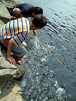 驚くのは、魚の大きさで、コイはアベレージ70cmで、メータークラスもいる。ウグイの数もすごいんだけど、大きさも驚きで、大きなのは45cmクラスではないだろうか? (→写真はウグイの群れ) 北日本には大きなウグイが居るのは知ってましたが、九州でウグイがこんなに大きくなるとは知りませんでした。 ”洞門”自体は、正直言っていまいちでした。 |