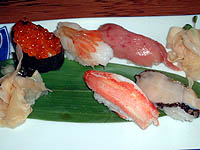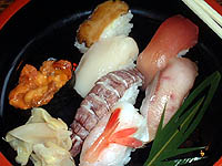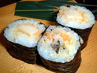 | お昼は、美国のふじ寿司です。昔、ふじ寿司とならんで、えぞ寿司っていうのがあったのですが、無くなってしまって、ふじ寿司の駐車場になっていました。ふじ寿司はすっかりメジャーになり、すすきの、小樽、ニセコに支店があります。真ん中の写真は、”積丹巻き”と言って、”あわび”と”うに”の巻物です。他ではなかなかお目にかかれません。 |