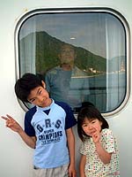 朝7時に札幌の実家を出て、8時前に小樽のフェリーターミナルに着いてしまいました。別に急ぐ必要はないんだけど、とりあえず乗船待ちの一番に並んでしまいました。そこで座り込んでトランプです。乗船は、9時からで、出航は10時です。 今日は、”ラベンダー”です。この船は昨年の夏の北海道キャンプの帰りにも乗った船でした。