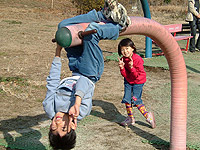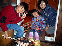 お正月なので、贅沢して冷暖房付きのログハウスに泊まることにした(→)。中は快適そのもの。フトン、冷蔵庫、食器、調理道具などすべて完備されているので、必要なものは、食材のみ。ログハウスのほか、通常のテントサイト、常設テント、オートキャンプサイトなど、様々な形のキャンプができるようになっている。