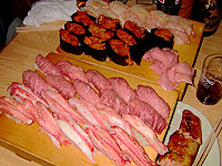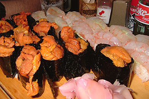 ■3/19日 札幌 久しぶりにおし鳥へ okBig氏、山さん、みなひと久しぶりに、北18条?のおし鳥へ行った。ここの食べ物はとにかくちょっと他とは違うのです。この4人で行って、”ちょっと握って!”の一言で出てきた寿司がこれです。タラバ、トロ、ウニ、甘エビの4種のネタ。どれもめちゃ旨いのだ。これで、普通の焼き鳥屋と同じ料金なのです。
