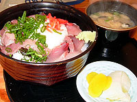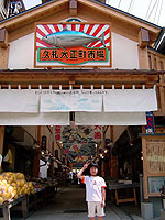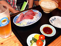 ■4/30日 中土佐 久礼大正町市場で初ガツオ 二日目、お目当ては”初ガツオ”。高知は初ガツオで有名だが、その中でも評判の高い、中土佐村久礼大正町市場へ向かった。市場は13:00から始まるらしく、我々が着いた時間にはまだ殆んどの店が閉まっていたが、カツオを食べさせてもらえる店”浜ちゃん”はやっていた。 ここで、まずはメニューを一通り確認するため、カツオ刺身定食(700円)、カツオ丼(550円)、それから定番のカツオたたき定食(700円)を注文。 まず出てきたのは、刺身と丼。うまい。カツオの生臭さはまったく無い。たたきが出てくるにはちょっと時間がかかったが、これは注文を受けてからワラを燃やしてたたきを作っているからとのこと。市場内の魚屋から直接持ってくる仕組みになっている。うまくて当然っていう仕組みが出来上がっている。 たたきは、もう絶品。思わず写真を撮るのを忘れてしまい、全部食べてしまった。カツオ食べるなら絶対ここがお勧めです(味と値段両方で)。