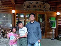 ■四万十川源流 天満宮前キャンプ場へ 二泊目は、いつもの天満宮前キャンプ場へ向かった。昼に、カツオを食べた中土佐町から14kmと非常に近い。四万十川の上流って、四国の山の中へ向かっているわけじゃなく、東へ向かっていて、海からこんなに近いのです。お風呂は車で7km程のところにある四万十源流の家だ。お風呂の後、暗くなるまで四万十川で釣りタイム。この日は、カズがかじかのような魚をエサ釣りで釣ったのみ。子供たちは食べると言って、炭焼きして食べてしまった。たぶんおいしい魚のはずだが、焼いて食べるような魚じゃないような気がするが...。 ■おともねさん一家と それから、釣りをしてる時に、キャンプ場におともねさんらしき車が現れた。行ってみるとやっぱりおともねさん一家で、うちのとなりにサイトを構えていた。昨年もここで会っていたことがキャンプの後でわかったのだが、今回はもしかしたら...と思ってたので、すぐにわかった。おももねさんは、この日高知にフェリーで上陸したらしい。