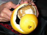 この時期こちらに来ると、小夏というおいしいみかん?が売っている。小夏は、写真のようにリンゴみたいに皮を剥いていただく。グレープフルーツに似た感じのテイスト。地域によって微妙に呼び方が違うようで、日向夏、小夏、土佐小夏、New Summer Orange、ニューサンマなど、様々な言い方がある。 New Summer Orangeと書いてある小夏を売っている店で、お店のおばちゃんにこれなんて言う種類?ってカズが聞いたら、”ニューサンマ”だと言われた。これを聞いて、Summerをサンマと勘違いしてるのかと思い、吹き出しそうになったが、たしかにニューサンマと言う言い方もあるみたいだ(愛媛に近い所で言うみたい)。 |