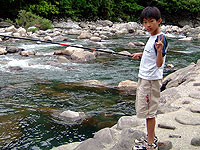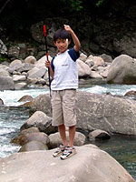 夕方前に、安田川アユおどる清流キャンプ場に到着。さすがにGWは、一杯の模様。前日に電話で予約しておいて良かった。 テントサイトを構えてから、さっそく川へ釣りに出たが、やっぱりあぶらびれは釣れない。カズがエサ釣りでオイカワを数匹ヒット。さすがに、カズもこれは食えないことを理解していて、釣りの後に、全部リリースだ。 私は、ずーっとボーズが続く。毎日カズが竿頭だ!