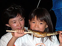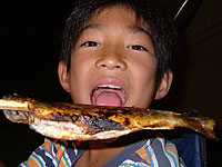 今日も知床野営場。巨大なオショロコマを塩焼きでいただく。このサイズだとさすがに食い応えあり。一番大きなやつは、うっすらと赤みをさした肉になってる。 |