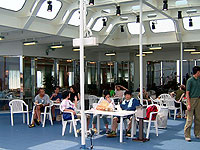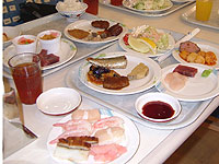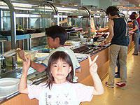 ■レストランは期間限定のバイキング方式 新日本海フェリーの課題のひとつは、”食事”だったと思うけど、このフェリーでは、期間限定(8月一杯)ではあるものの、朝、昼、夕食の全てにバイキング制を導入している。賛否両論あるとはあるうが、料金を考えなければ、好きなものを自由に食べられるメリットは大きい。今回、夕食でバイキングに挑戦したが、思いのほかマンゾクした。 朝食:1100円、昼食:1500円、夕食:1800円だが、高いと思うか、安いと思うか?微妙なところ。 このほか、オープンデッキでジンギスカン、カフェで丼物などが選択肢として存在する。本当はグリルという予約制の本格的なレストランがあるが、私が見る限り利用客は.....。それよりも、カップラーメンや、お弁当を持ち込んで食べる人が多いし、こちらの方がお薦めだ。