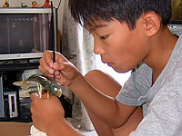夏休みの最終日に、カズが自由研究として剥製の色付け仕上げをやってくれた。思ったよりがんばっている。真剣なまなざし!