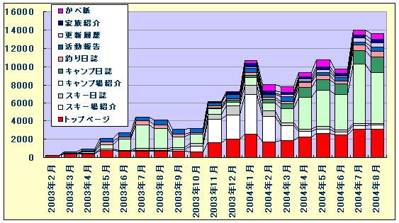 昨年の2/5にK's Outdoorを公開開始してから1年半が過ぎた。主なページのアクセス解析結果をまとめて見た。アクセス数は徐々に増加する傾向。夏はキャンプ場紹介、冬はスキー場紹介のページへのアクセスが中心。トップページへのアクセスは2000→3000回/月位まで増加してきたが、昨年の例だとこのあと9月、10月はアクセスが減りそう。