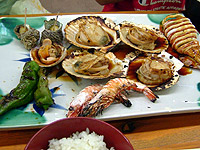 舞鶴に戻って、夕食です。”海鮮市場(←)”っていうのを見つけました。魚屋さんで、好きなものを選ぶと、焼いてくれる仕組みです。