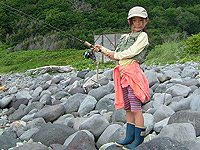 でもこんな時が昼間でも釣れる時でもある。とうとうママがヒット。波に乗せて一気に引っ張り上げた。
