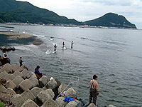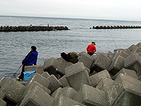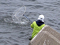 仕事の都合で札幌に行ったが、サケが釣れてるっていうのを知ってたので、なんとか釣りに行けないかといろいろ画策していたのだが、あえなく断念して半分あきらめていた。ところが、仕事を終えて、札幌の実家に帰ると、母と妹がせっかくだからどっか行こうと言い出し、じゃ行こう!とすぐに決定。 9/17(土)の朝に、近くのレンタカー屋にTelしてレンタカー(トヨタのIST)をゲット。アメリカ屋漁具に行って、釣り竿とリール(3mの投げ竿とリールのセットで1470円)と、浮きルアーの仕掛けと、イカのエサを買い込み、積丹に向かった。 ■9/17 積丹へ 古平川河口でサケ釣りを観戦 早速、古平川に到着し、河口へ行ってみると、20〜30人くらいの釣り人が竿を振っている。8割が浮きルアー、1割がルアー単体、残り1割弱がフライという感じか? こんな風にサケ釣りをショアからやるようになってからは、始めて見に行ったので、ちょっと思っていた感じとは違う。もっと投げ釣りをやってる人が多いか?と思っていたが全くいない。
