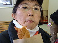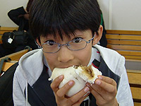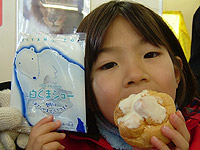 | ちょっとおやつタイム。白くまシュー、ジンギスカン肉まん、サケ肉まん、きなこドーナツなど、食べたことがないものばかり。しかもみんなおいしい。 |
