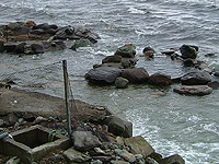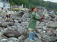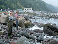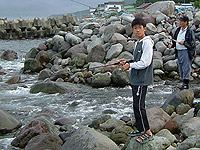 | 小雨の中、夕方には潮もいいので、期待しつつ建根別川の河口に入った。早々に、隣のおじさんに当たり有るが、バラしてしまう。その後、私にヒット。すぐ岸近くでいきなりヒットしたが、どう取り込むか?なんて思ってるうちにバレてしまった。がーん!!!!。その後、全くだめ。この日はこれでゲームオーバー。 |