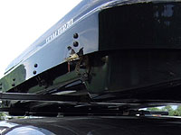 高速で走っているときに、フロントウィンドーに思いっきりぶつかってきた緑色の虫?がいた。あとでSAで見たら、ウィンドーではねて、そのあとルーフボックスのちょうつがいに激突したようだ。ごめんなさい。トノサマバッタでした。