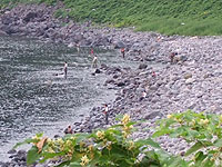 夕方、ウトロに到着。まずは知床野営場にテントを設営し、あとは釣り場の偵察。毎日走って来たので、さすがに疲れたので、この日は見学のみ。ペレケの河口には、なんと道の駅ができており、釣り場のすぐ脇に観光客がたくさんいる。だいたい、河口の目の前にホテルが建ったようだ。ここに泊まって浴衣すがたでカラフトマス釣りなんてのができちゃう!!