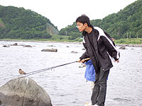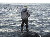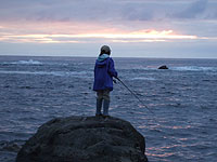 やはりこの日も波が高く、ペレケ以外は難しそうだったが、フンベは沖に岩があるので、行ってみることにした。皆さん考えることは同じで、混んでいて家族4人で入れる場所がなく、一番端っこに4人で入ったが、魚の反応がない。河口付近の人たちは、ポロポロと挙げているようだ(と言っても釣れてるのは数人)。だんだん日が落ちてきてから、釣り人が帰り出し、いいポイントに入ったら、やっと1本ヒット。小さいながら銀ピカのマス。ルアーはクルセイダー10gのGold。