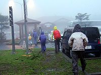 夏休み中は、マイカー規制があるため、水ヶ塚公園の駐車場からシャトルバスかタクシーで五合目まで行くことになっている。朝3時半に家を出発。天気がいまいちで、5時頃水ヶ塚公園に着く頃には、結構な雨が降っていた。しかたがないので、レインウエアを着て出発。少し悩んだが、ここまで来たので、行ってみることにした。