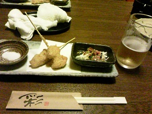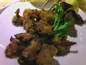 | 夜は、喜八(きはち)。これが失敗。網走まで来たのに、ホタテ焼きのあまりの貧相さに驚き。確かにホタテの実入りがいい時期ではないが...。どうも観光客相手の新しいお店だったようだ。つぶ貝の唐揚げ(→)もあららって感じ。鯨が売りだったみたいだけど。東京にありがちな北海道を売りにしたお店って感じだ。客も観光客が多い。店のつくりは抜群で高級感もある。しかしながら、料理があまりにもプアだ。安い居酒屋のチェーン店の味そのもの。ミシュランに載ったってことだったが、ミシュランも信じられなくなった。 |