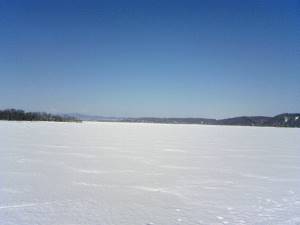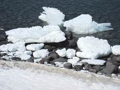 湖のアウトレットのところは氷が溶けて湖面が見えてます→ |