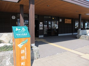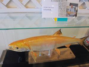 | ウトロ道の駅、うとろ・シリエトク。ペレケの河口目の前にある道の駅。黄金のサケ(アルビノ)の剥製が飾ってあった。H23.10.31の朝に、ウトロの定置網に入ったアルビノのサケ。天然もので、ここまできれいなのは珍しいらしい。 |