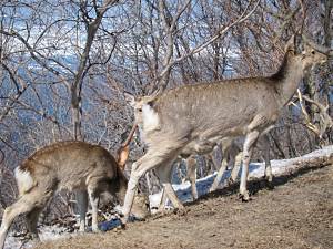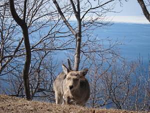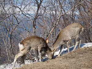 ↓そしてお決まりの”エゾシカ”。シカのバックにも流氷が見える。冬に角が落ちてるので、ない。一生懸命に草の芽を食べてた。シカ増えすぎて、草どころか、木の皮までやられちゃってる。ちょっと考え物です。保護し過ぎなんだろうけど、おおっぴらに駆除することには反対の人も多く。 |