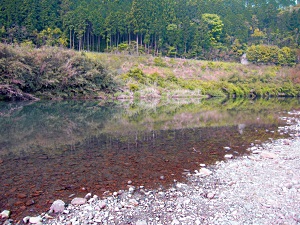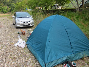 | 朝は、天満宮前キャンプ場でのんびり。今回は、四万十の河原に小さなドームテントを張ってエコキャンプだ。この時期にはめずらしく雨が少ないのか、川の水位はかなり低い。今回は釣りしなかったけど、これじゃたぶんやっても釣れない。 |