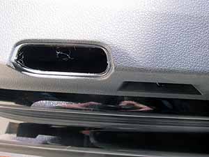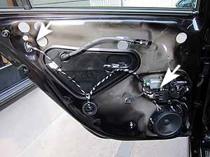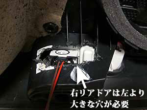 右リアドアへの設置:左よりも加工量増加 コネクタもあたるので、大きな穴あけ必要 |