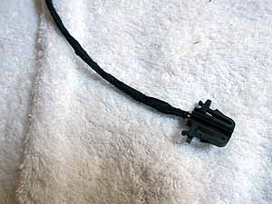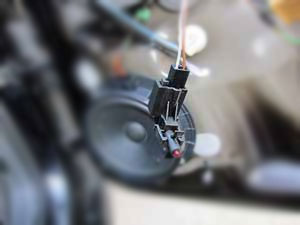 | 右ドアも、ドア後ろ側のドアコンタクトSWのコネクタからマイナスを取り出します。上から二番目なのは左ドアと同じですが、こちらは"5"と書いてあります(左は"2")。プラス側も左と同様にパワーウィンドーモーターユニットのコネクタ裏から取ります。一番端の太い配線から分岐します。 |