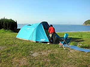 初日は何もできなかったので、朝キャンプ場内を散策。どうやら夏は海水浴客でにぎわうキャンプ場らしい。結構広くてテントサイトは芝生なので気持ち良い。炊事場もトイレも管理棟もしっかりしている。シャワー棟もあったが、稼働は夏だけかな?