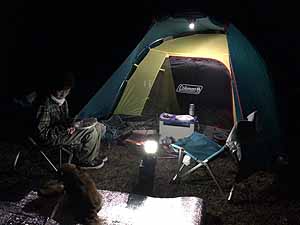 | 結局、日ノ瀬清流公園というところにテントを張ることにした。客は誰もいない。設備は水洗トイレのみ。河川敷も誰もいないのでひとりじめだ! |