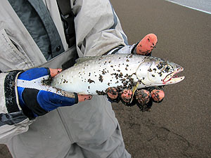 もうあきらめかと思うころ、6:30前にママに40cmのアメマスがヒット。ルアーはOFTウミアメチャン28g。波きついのでこのあと撤退。