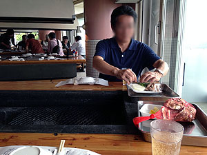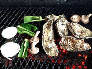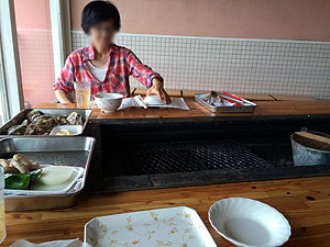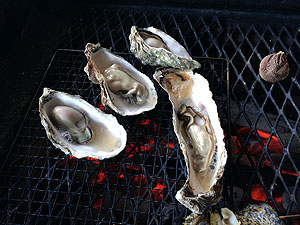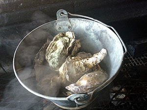 テーブルの真ん中に炭があるので、そこに焼き物を。で、バケツの酒蒸しは、牡蠣と酒が入ったバケツを炭の上にどんと置くだけ。10分ほどでできあがり。