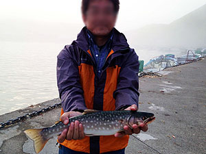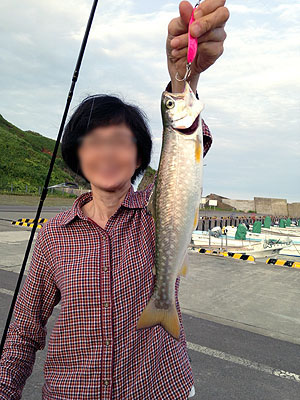 さて、夕マズメは貰人漁港でアメマス釣り。最初、河口付近でまったくだめだったが、東防先端にいたカレイ釣りの人が帰ったので、18:00丁度に、そこに移動。とたんにママにアメマスがヒット。