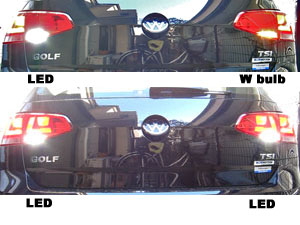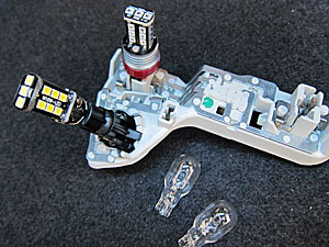 AliExpressでバックランプ用に、2835chipを15個配置したタイプのLEDを購入($5.48/2pcs)。トランクリッドを開けて、カバーを手で外すと簡単にアクセスできる。黒い十字を半時計回りに回すと、バルブごと外せる。ここにポンづけでLEDと交換するだけ。消費電力は公称7.5W。明るすぎるくらい明るいので、LEDの寿命も考えてコーディングで少し輝度を落とした。