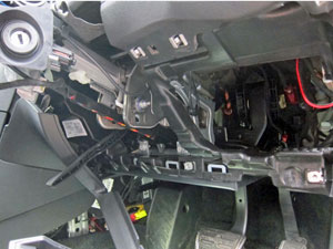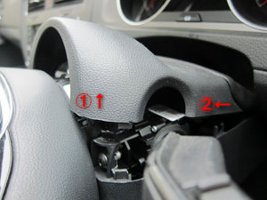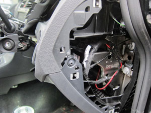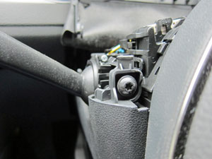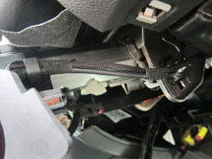 ステアリングのコラムカバー脱着が必要です。コラム上部カバーは、まず手前側を上に持ち上げるだけで両側二か所の爪が外れます。固ければ、ハンドルを90°切って、隙間にリムーバー(かマイナスドライバー)を差し込んで抉ると外せます。この上部カバーを上にあけた状態で全体を少しだけ手前に引くと奥側の爪(開閉する軸のようになっています)も外れます。次にステアリングを左右にそれぞれ90°切ると、トルクスビスが顔を出すので外します。最後にカバーボトムにあるトルクスビスを外します。これで下部のカバーも外れます。それから横の小物入れ、ダッシュボードサイドパネルとボトムカバーも外しちゃって、イグニッションキー部から運転席部のフットウエルライトまでLEDベゼルの配線を引っ張ります。ステアリングは位置調整範囲があるので、配線にストレスがかからないようにしないといけません。配線保護の網組チューブをかぶせてステアリング基部まで引っ張りました。で、小物入れ部の奥からサイドパネルのあたりでフットウエルライトの配線にパラ接続して、しっかりと配線を整理。