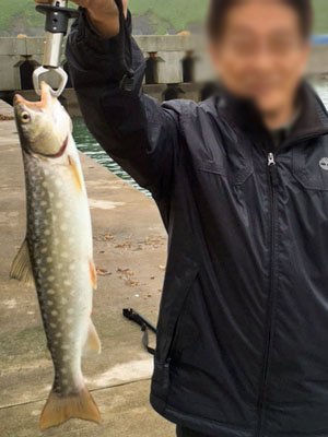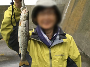 | 私の方は、17:30頃、40cmのアメマスがヒット。外防の先端部分でテトラとテトラの間をサスペンドタイプのミノーで誘い出した形だった。 |