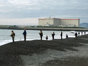 朝起きて海見たら、ずらっと15名ほど。皆さん通勤前に竿振ってるようですね。こうなると我が家は出撃意欲がなくなってきます。波もだんだん高くなってきてるし。波高いので、皆さん砂浜の一番高いところから竿振っているが、たまにそこも超えて大きな波が来るようだ。