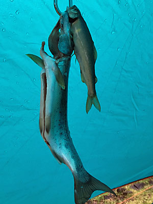 朝釣りあげたアマゴはお腹を出して、軽く塩を振ってこんな風にちょっと干します。これで味がグンとよくなる。で、夕刻に炭火でじっくり焼き上げるのです。最高!