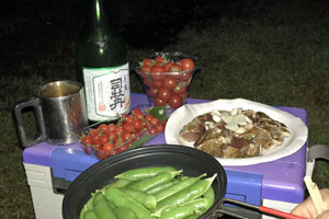 雨が強くなってきて、ほかのお客さんはほぼ撤退。我が家はのんびりと、、、かつおとお酒で。