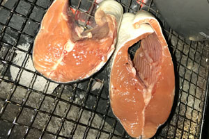 カラフトマスは炭火ステーキに |