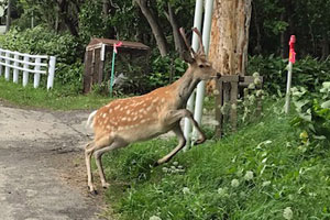 夕陽台の湯の前でエゾシカ