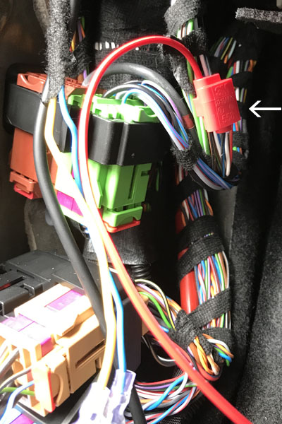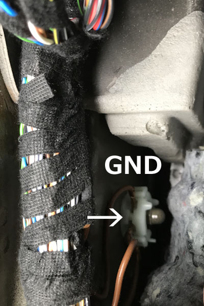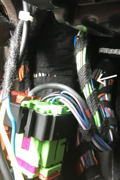 キックパネル内の配線束からリバース信号を探した。黒/青のコードがリバースラインなので、数あるコードの中から探すしかありません。念のためテスターでバックに入れた時に12Vが出ることを確認しました。このリバース信号配線を分岐してコードをユニットにつなぎ、GND線をアースポイントにもっていけば完成です。アースポイントは、キックパネルとサイドシルの継ぎ目あたりの下にあります。このあたりもGolf7と全く同じ。